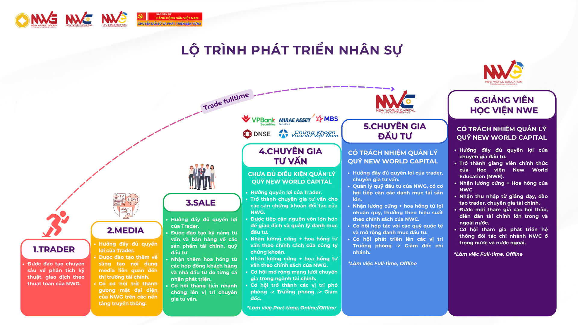Các thành viên sẽ trải qua những bài kiểm tra và những cuộc thi nội bộ để từ đó tìm ra những ứng viên cho các vị trí Trader chuyên nghiệp/ Giảng viên/ Chuyên gia Tư vấn/ Chuyên gia đầu tư, với thu nhập hấp dẫn và cơ hội xây dựng đội nhóm với những thành viên được New World Education đào tạo kỹ lưỡng.